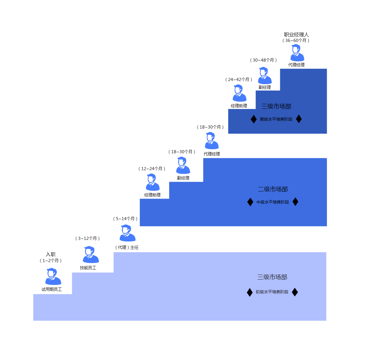 根據員工發展的階段和特點,分別製定培養訓練方案,依據訓練成績,實行晉升;最終將員工培養成職業經理人。