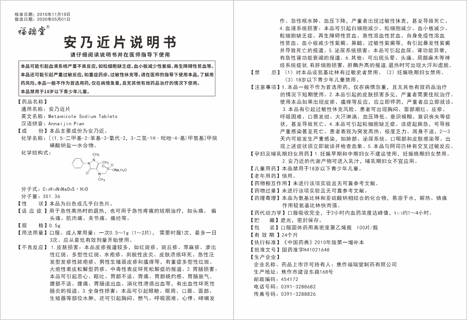 安乃近片(100片)說明書
