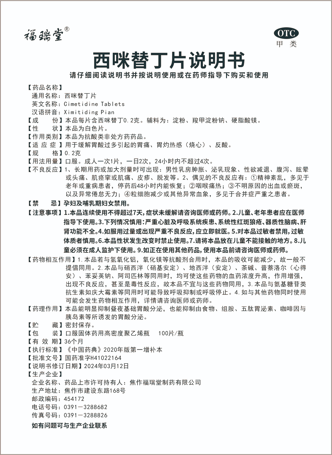 西咪替丁片(焦作)說明書