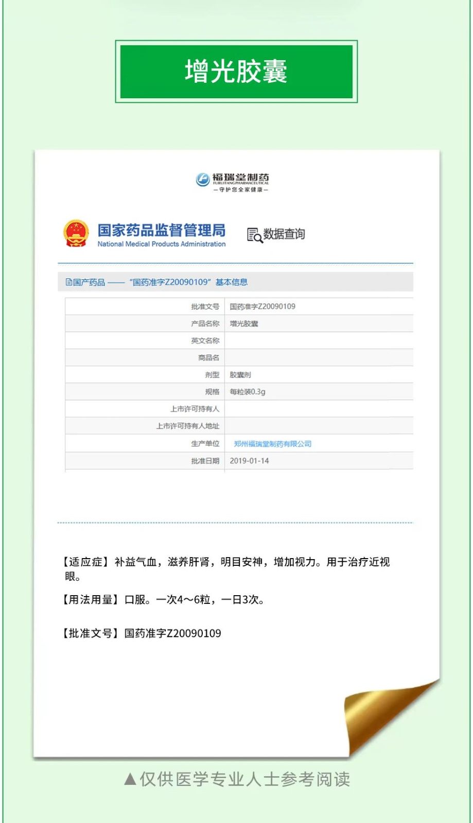 福瑞堂製藥作為鄭州市高新技術企業,其中一款全新中藥治療近視產品--福瑞堂增光膠囊2009年獲得國家藥監局批準,國藥準字Z20090109,增光膠囊由黨參、當歸、枸杞子、茯苓、麥冬、澤瀉、五味子、石菖蒲、牡丹皮、遠誌(甘草水製)等10味中藥材精心炮製而成,國家藥監局明確批示功能主治:補益氣血,滋養肝腎,明目安神,增加視力。用於治療近視眼。《臨床醫藥文獻電子雜誌》2019年第6卷第71期 由湖南省常德市澧縣中醫院孫軍主導的增光膠囊在近視患者中的臨床治療效果及對藥物安全性、視力的影響研究 一文中得出結論:增光膠囊在近視患者中得到應用,且效果理想。增光膠囊屬於中成藥物,臨床使用時藥物本研究中,兩組治療前裸眼視力、屈光度及眼軸長度比較差異無統計學意義(p>0.05):觀察組治療後裸眼視力、眼軸長度,高於對照組(p<0.05);觀察組治療後1年屈光度,低於對照組(p<0.05),說(shuo)明(ming)增(zeng)光(guang)膠(jiao)囊(nang)用(yong)於(yu)近(jin)視(shi)患(huan)者(zhe)中(zhong)能(neng)獲(huo)得(de)良(liang)好(hao)的(de)治(zhi)療(liao)效(xiao)果(guo),有(you)助(zhu)於(yu)提(ti)高(gao)患(huan)者(zhe)視(shi)力(li),降(jiang)低(di)屈(qu)光(guang)度(du),利(li)於(yu)患(huan)者(zhe)康(kang)複(fu)。增(zeng)光(guang)膠(jiao)囊(nang)是(shi)近(jin)視(shi)患(huan)者(zhe)中(zhong)常(chang)用(yong)的(de)治(zhi)療(liao)藥(yao)物(wu)。方(fang)藥(yao)由(you)當(dang)參(can)、澤瀉、當歸、枸杞子、茯苓、麥冬、石菖蒲、牡丹皮、五味子、遠誌(甘草水製)組成。增光膠囊由於屬於中成藥物,臨床使用時藥物安全性相對較高,有助於提高患者耐受性、依從性。本研究中,兩組治療期間眼幹澀、顱內壓升高、血壓異常、頭暈耳鳴及藥物過敏發生率均無統計學意義( P >0.05),說shuo明ming增zeng光guang膠jiao囊nang用yong於yu近jin視shi患huan者zhe中zhong藥yao物wu安an全quan性xing較jiao高gao,藥yao物wu並bing發fa症zheng發fa生sheng率lv較jiao低di。但dan是shi,由you於yu每mei一yi位wei近jin視shi患huan者zhe誘you因yin不bu同tong,治zhi療liao過guo程cheng中zhong應ying加jia強qiang患huan者zhe基ji礎chu疾ji病bing治zhi療liao,動dong態tai監jian測ce患huan者zhe視shi力li,及ji時shi調tiao整zheng治zhi療liao方fang案an,促cu進jin患huan者zhe早zao期qi恢hui複fu。