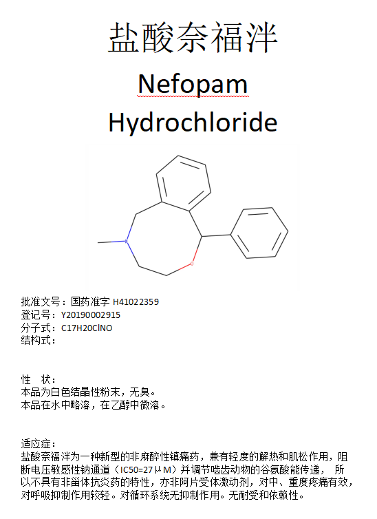 功能主治:鹽酸奈福泮為一種新型的非麻醉性鎮痛藥,兼有輕度的解熱和肌鬆作用,阻 斷電壓敏感性鈉通道(IC50=27μM)並調節齧齒動物的穀氨酸能傳遞, 所 以不具有非甾體抗炎藥的特性,亦非阿片受體激動劑,對中、重度疼痛有效, 對呼吸抑製作用較輕。對循環係統無抑製作用。無耐受和依賴性。
