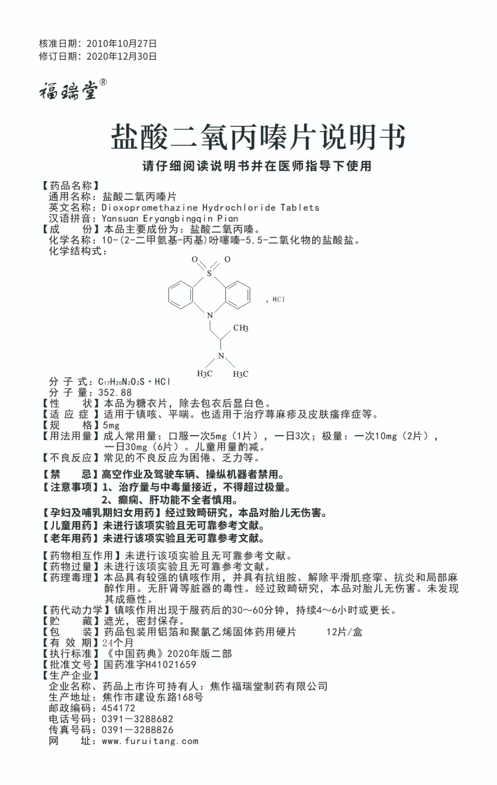 英文名稱:Dioxopromethazine Hydrochloride Tablets