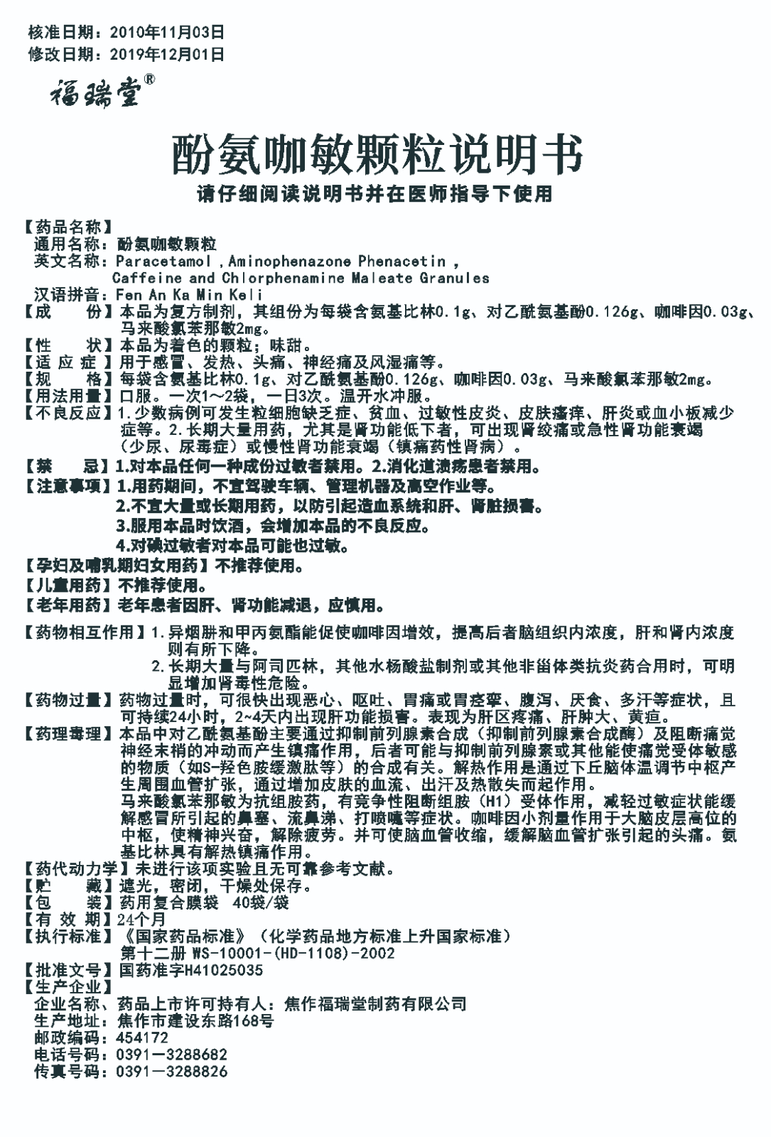 規格:每袋含氨基比林0.1g、對乙酰氨基酚0.126g、咖啡因0.03g、馬來酸氯苯那敏2mg。