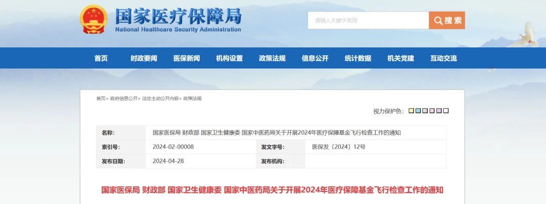 4月28日,國家醫保局、財政部、國家衛健委、國家中醫藥局聯合發布《關於開展2024年醫療保障基金飛行檢查工作的通知》,覆蓋全國所有省(自治區、直轄市及新疆生產建設兵團)以及各類醫保基金使用主體的國家飛行檢查正式開始。