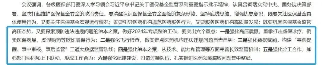 一周之前,國家醫保局、最高人民法院、最高人民檢察院、公安部、財政部、國家衛健委六部門聯合印發《2024年醫保基金違法違規問題專項整治工作方案》;4月8日,國家醫保局等六部門已經聯合召開2024年全國醫保基金違法違規問題專項整治工作會議,部署2024年重點工作。