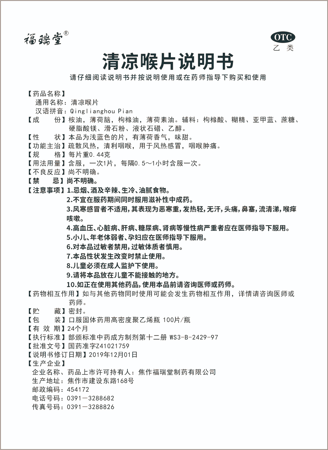 清涼喉片(100片)說明書